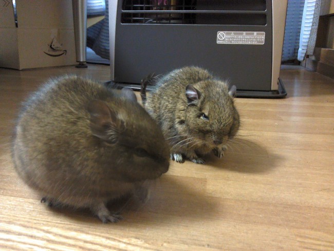 2013/02/10、朝、ファンヒーターの前で温まるデグーです。