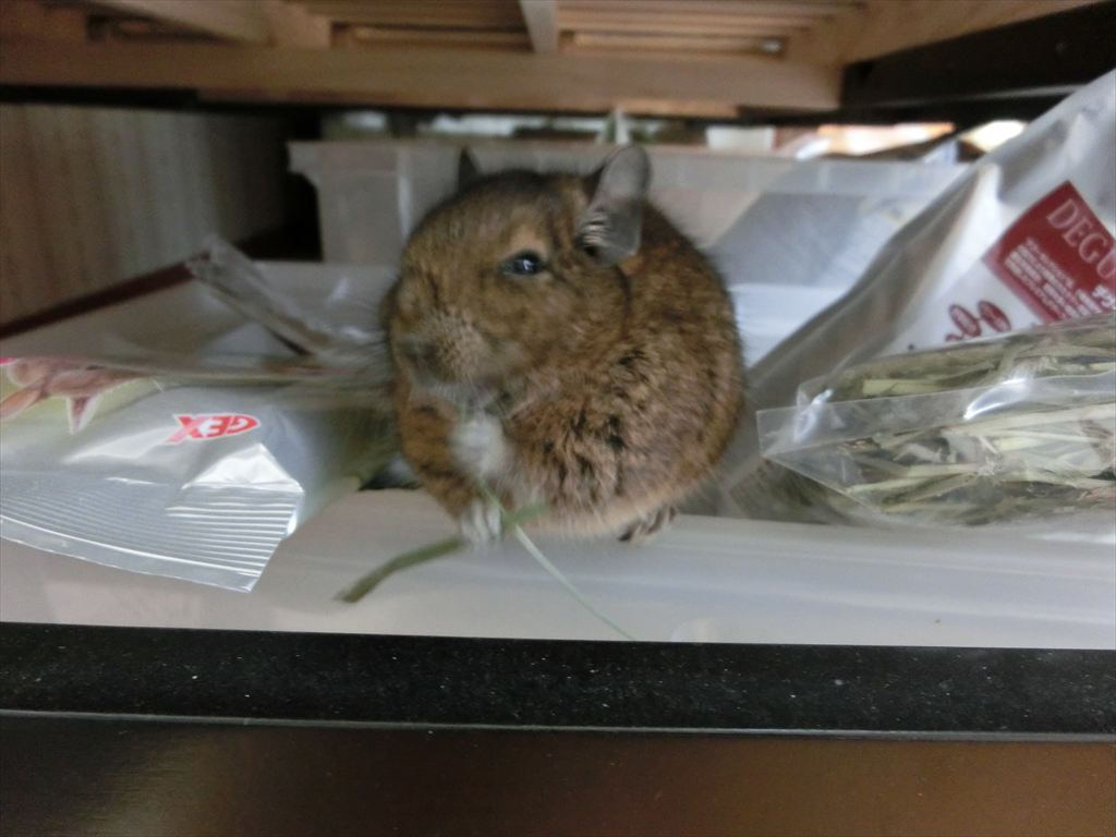 散歩の途中、3番刈りチモシーの袋を見つけてつまみ食いするタロウ。