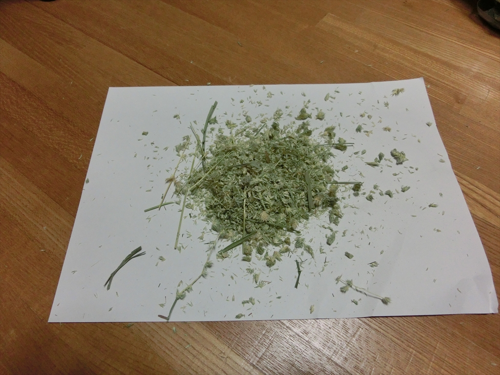穂から種をはさみでこそいでみた。最初は、穂をはさみで細かく切っていたが、こそげ取れることに気がついてからはそっちで。