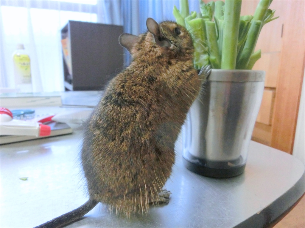 コップに挿したブロッコリーの茎をかじろうとしてます。