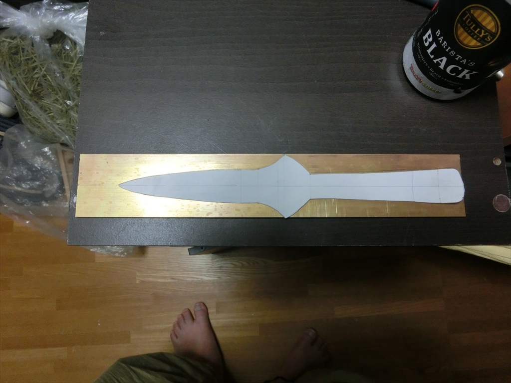 型紙を真鍮の板に当て、ケガキペンで周囲をなぞる
