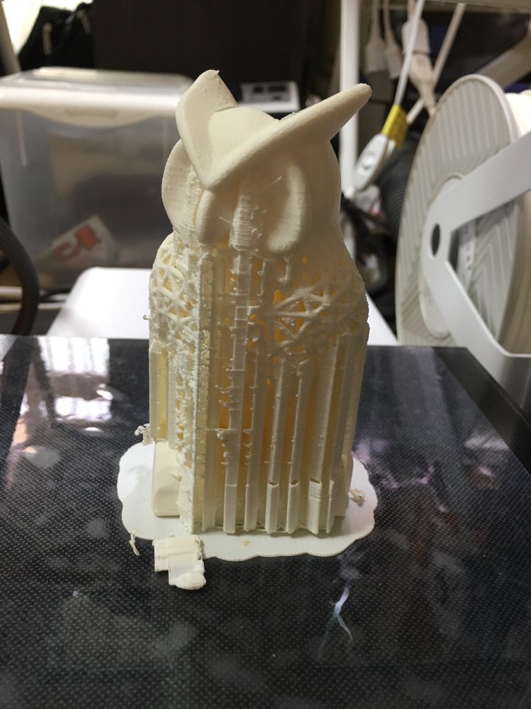 出来上がったフクロウ。ここから支持材のカットが必要。