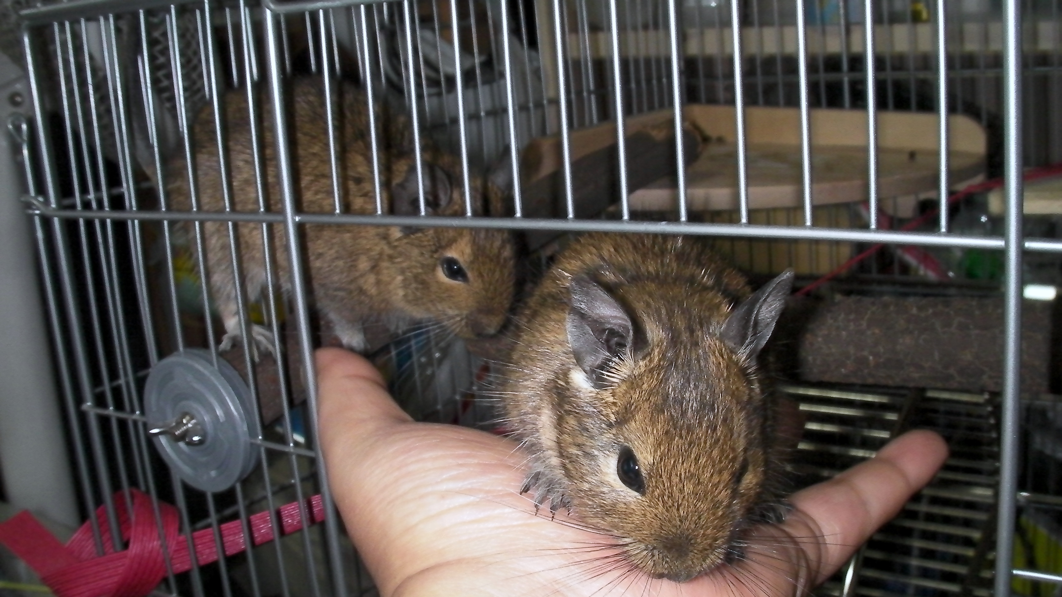 二階のドアから脱出を計るデグー達の写真2 手のりしてて可愛いけど、写真撮る方は脱出されないように必死です。