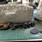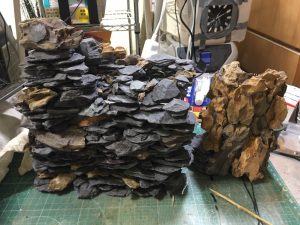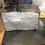 マリーナM 水槽ブラックを購入し、オブジェを作成。オブジェは、水中ポンプとヒーターを隠し持てるようにアクリルのボックスを核とした。ボックスと別に岩の壁を作り、蓋にも岩の壁。そうすることで水量を稼ごうという腹だ。