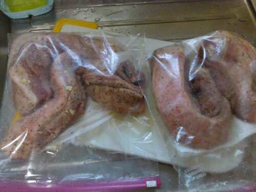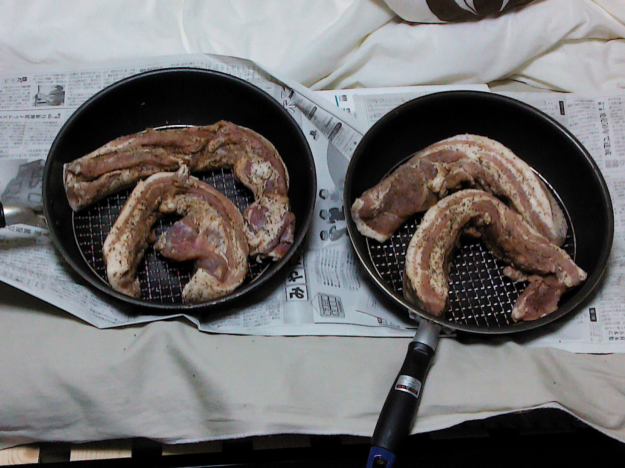 今朝見てみたら、昨日漬けたベーコンから肉汁が溢れてた。なので底に敷いてたキッチンペーパーを交換。ジップロックの蓋が壊れてたのでこれも交換。