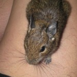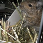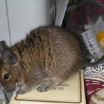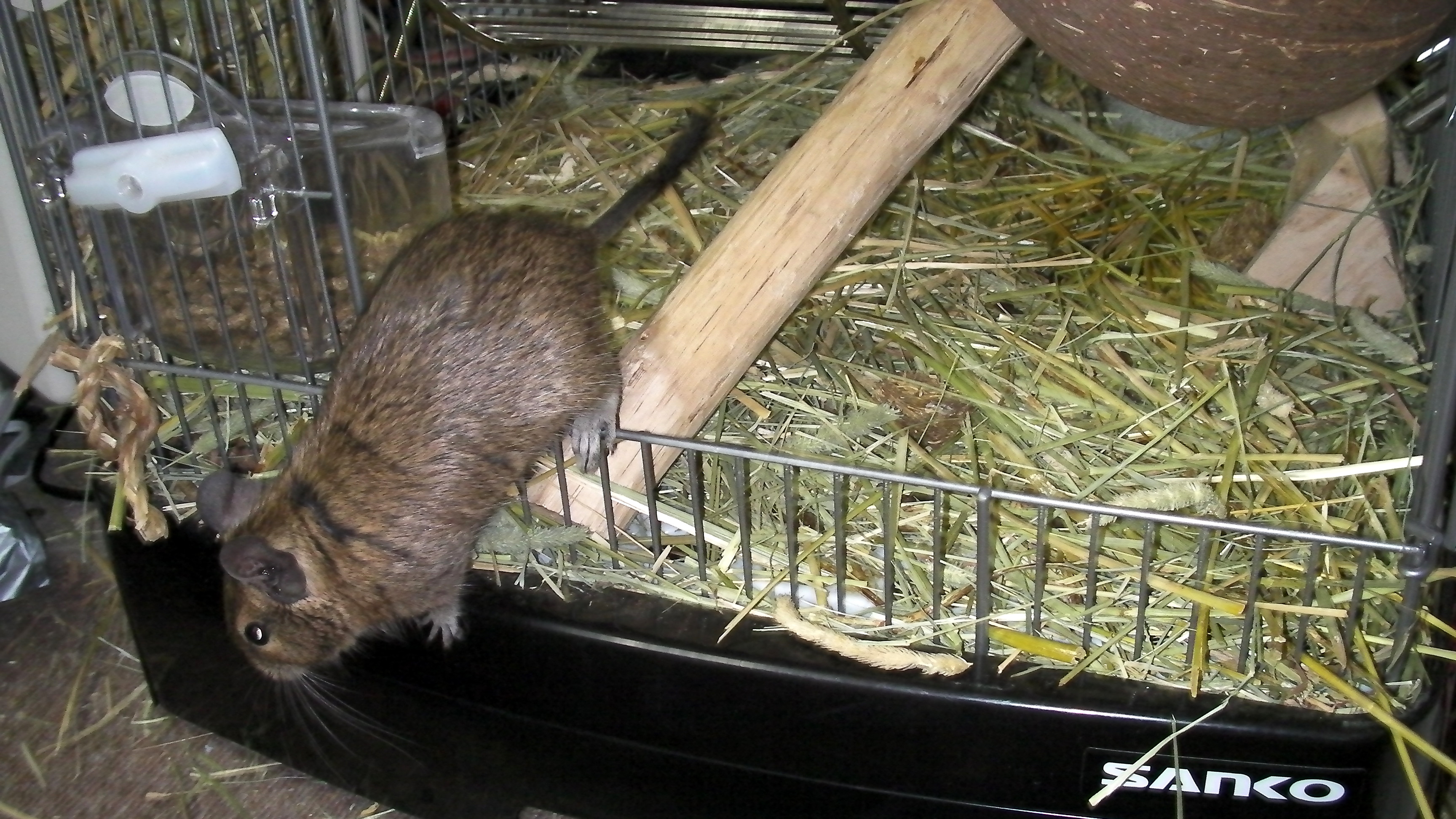 今朝、ケージのそばに居るとデグー達が「出せ出せ」とせがむのでちょっとだけ出してあげた。部屋ん歩で部屋中に散るのかとおもいきや、俺の足の上やら周りやらをうろうろ。どうやらエンバクが欲しかったらしい。エンバクの袋を持っただけで駆け寄ってきた。かわいいのう。