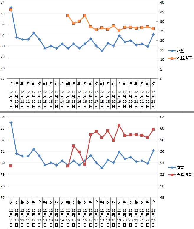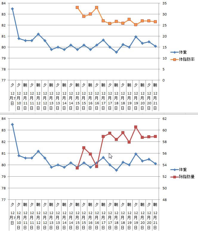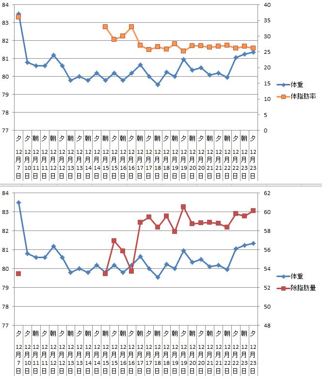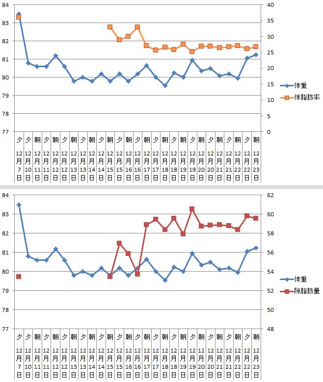 体重の変動は予想の範囲内だったが、体脂肪率が下がってるのに驚いた。24%と言う数字はダイエットを始めてから初めて見る数字だ。嬉しいな。後はこの調子で体重が下がってくれればOKだな。