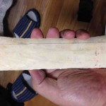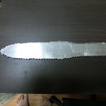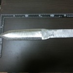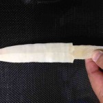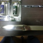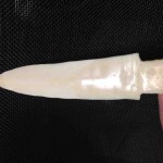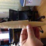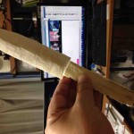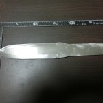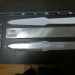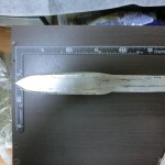 これをリューターで削り、ヤスリを掛け、コンパウンドをかけて刀身と中子を作る。言うと簡単だが、実際やるとなると結構大変だ。刀身が歪んでしまうと駄目なんだが、これがあっという間に歪んでいく。ゆがみを補正するために削ると、こっちが歪みあっちが歪み……。どんどん刀身が細く短くなっていく。それにダガーを作る材料は骨一本まるまま使うので、材料費も馬鹿にならない。