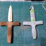 出来上がったら柄を作る。今この段階だ。柄は木粉粘土で一本、エポパテで一本作っている。どっちがよいか比べている。出来れば両方上手く行くと良いんだが。