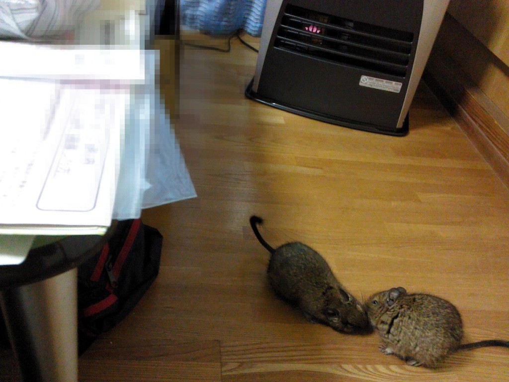 ストーブ前のデグー から sougetuOte | 2012/12/04 - 11:06 |2012/12/04 デグー 今朝、ストーブを付けると、デグーたちがストーブの方向を向いて暖をとっていた。 そこで、ちょっと散歩に出してやると、ストーブの前で二匹仲良く温まってた。写真の様な感じでしばらくピルピル鳴きながら温風の前であったまってる様子を見るとこっちもほっこりするわー。 ストーブの前で暖をとるデグー ブックマーク パーマリンク.