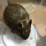 - 体重測定用のカゴの中でエン麦を食べるハヤテ