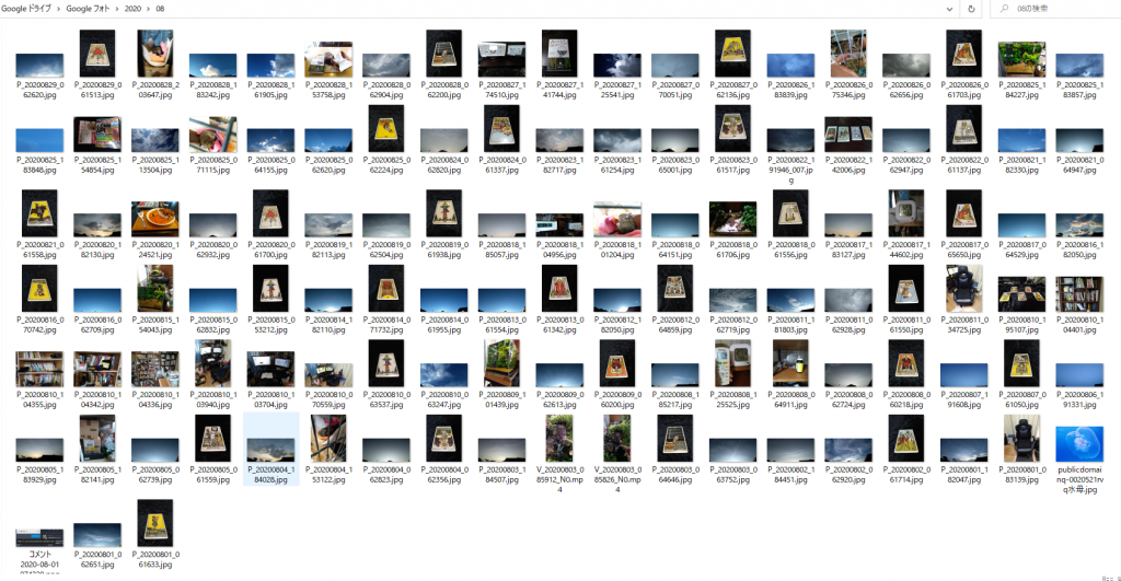 8月の写真フォルダ から sougetuOte | 2020/08/29 - 07:26 |2020/08/29 日記 今月撮りためた写真。 私は基本的にスマホで撮った写真は年月のフォルダに分けて取っている。このスクショは今月の物。今月はまだ2日有るけど。ふと見たら、結構取っているもんだなあと思ったので貼ってみる。 [ ブックマーク パーマリンク.