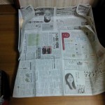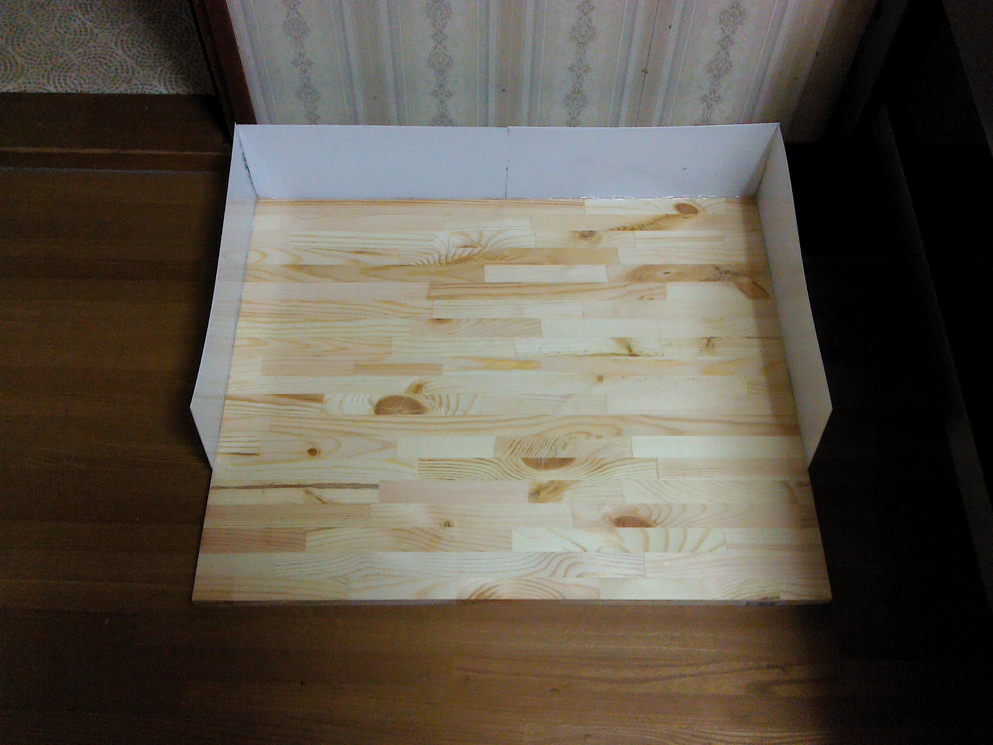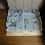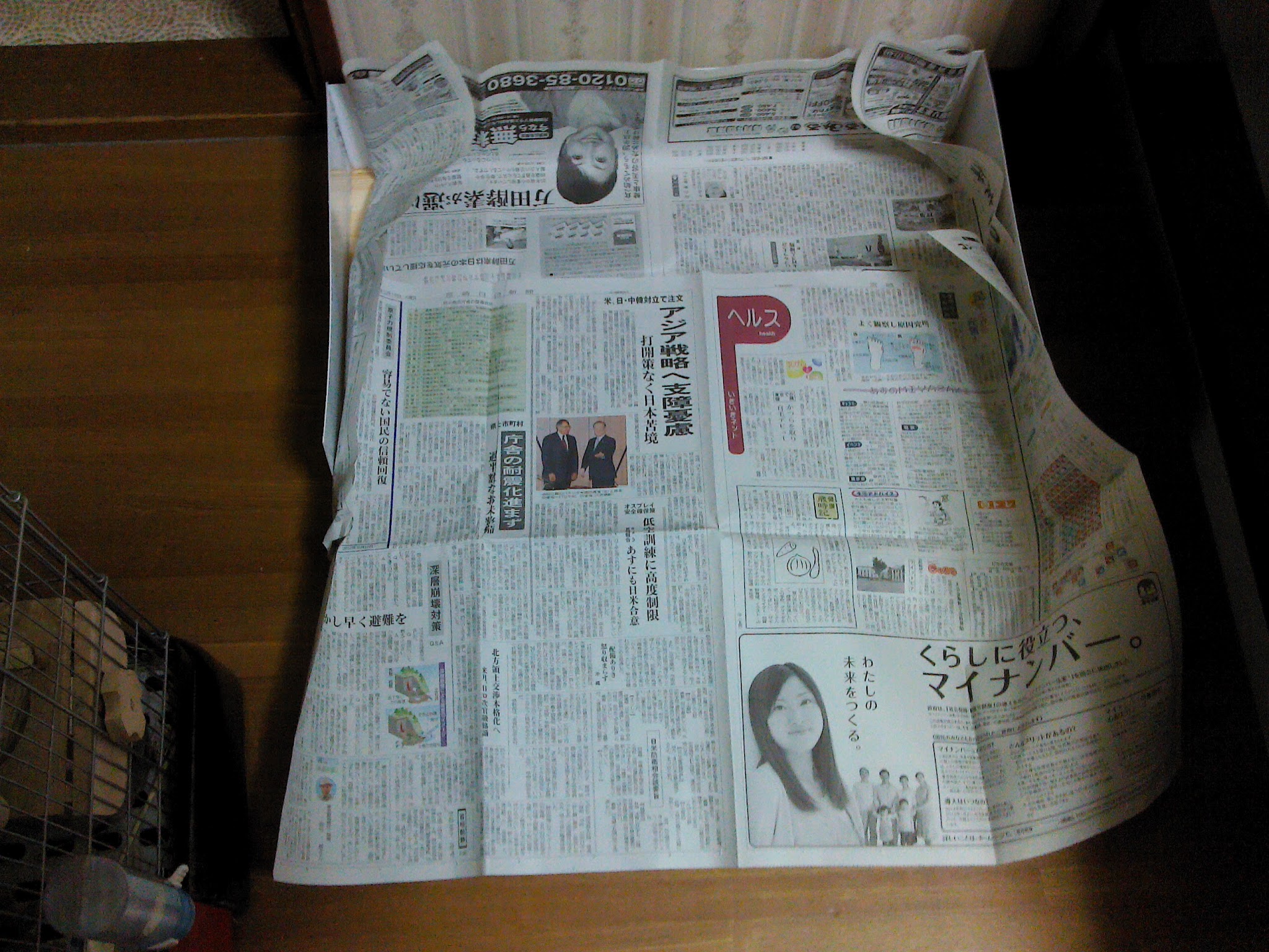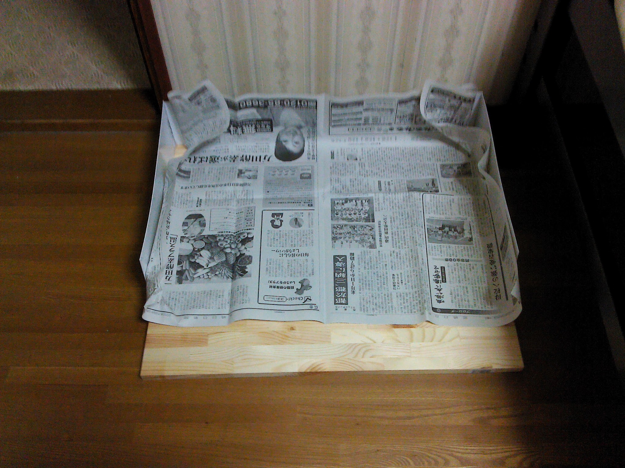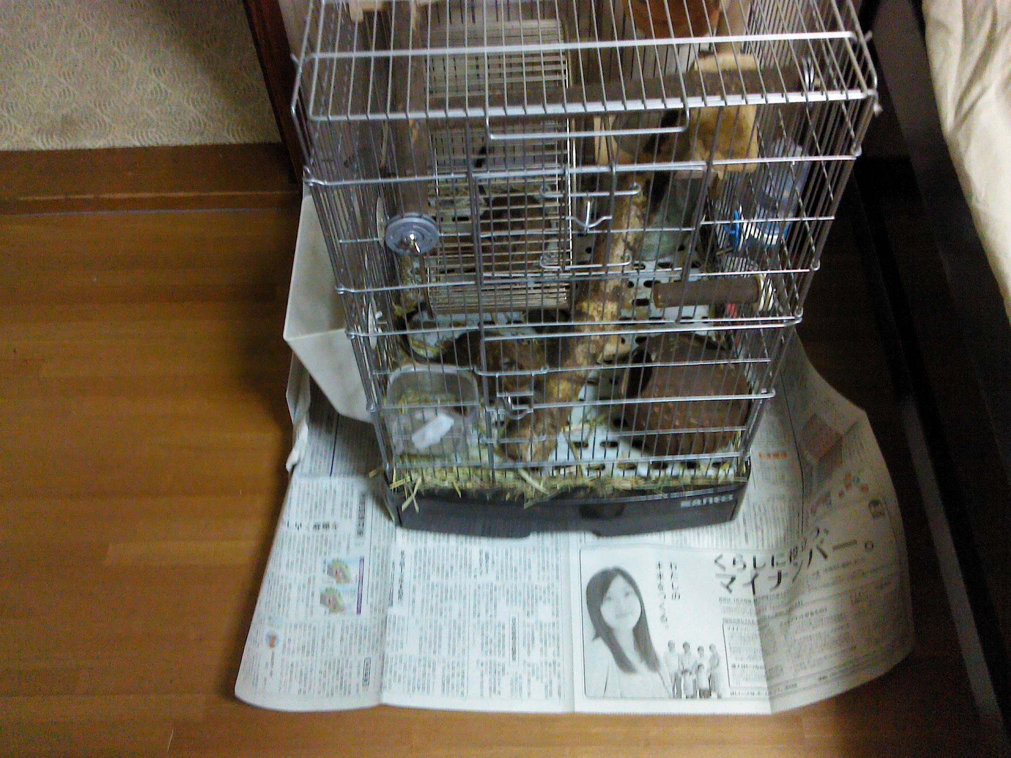 次に、ケージの下に板を張り、その周りにプラ板で囲いを作った(写真参照)。それでも多少不安なので、尿対策に新聞を敷き、万全を期した。