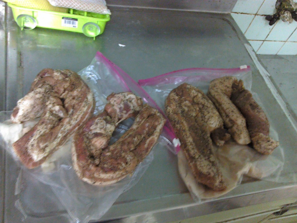 ベーコン制作途中 から sougetuOte | 2012/11/16 - 21:47 |2012/11/16 料理 一週間塩とスパイスでつけ込んだバラ肉。これから流水に漬けて塩抜きします! んで、明日は乾燥と燻製!! 塩漬け済みの豚バラ肉 ブックマーク パーマリンク.
